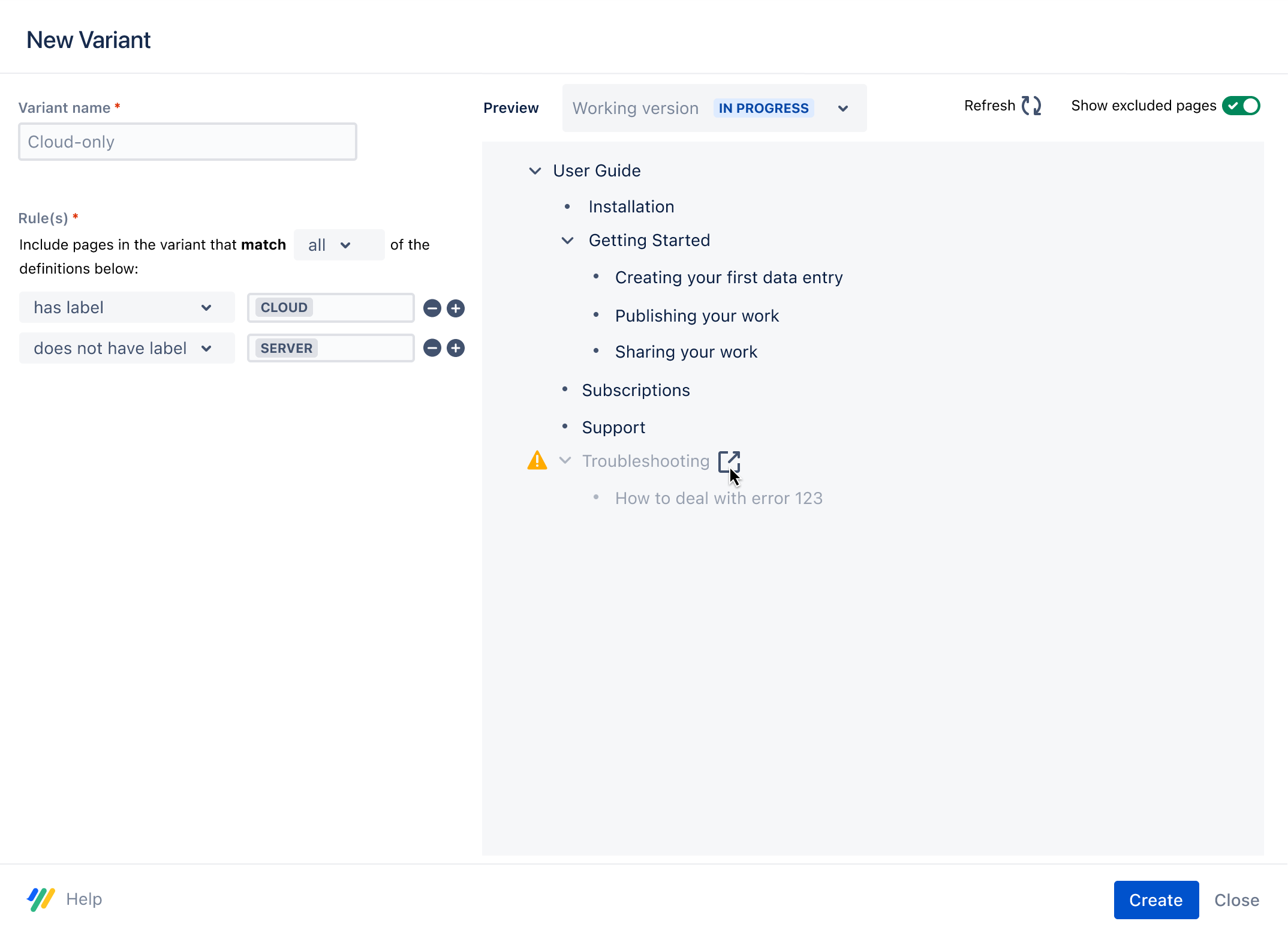 Defining variants of your content can save a lot of time and effort when you’re delivering similar content to different audiences e.g. a user and admin guide. In Scroll Versions, this was done by assigning attributes to pages and creating selection rules for every variant. With Scroll Documents, we decided to simplify this process by basing the rules on page labels without reducing how complex rules can become.